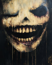 “The Laugh That Paints Itself” captures a twisted moment of grotesque delight. This close-up of a skull-like face with pitch-black eye sockets and a smeared, toothy grin feels like something torn from a disturbed cartoonist’s canvas. The dripping paint blurs the line between expression and eruption — a smile so wide it can’t be contained. Perfect for fans of macabre humor, surreal horror, and art that laughs back. A bold and eerie piece for anyone who appreciates unsettling absurdity on their walls.