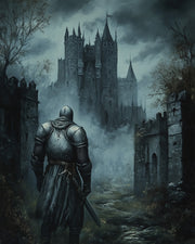 The Last Vigil captures a haunting moment of solitude, bravery, and quiet determination. A solitary knight clad in battered armor faces a decaying, mist-shrouded castle — a symbol of forgotten glories and looming trials. The dark, moody palette paints a story of honor, sacrifice, and the heavy silence before a final battle. Perfect for lovers of medieval fantasy, dark epic tales, and atmospheric, story-rich art.