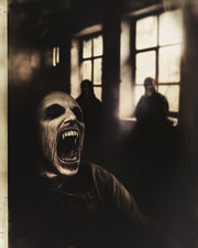 “Shriek of the Forgotten” captures the raw terror of a nightmare bleeding into the waking world. The figure in the foreground — mouth stretched impossibly wide in an inhuman scream — evokes pure dread, while shadowy, distorted figures loom silently in the background. The faded, sepia-toned palette enhances the unsettling, timeless quality, making the scene feel like a cursed memory. This poster is perfect for those who embrace dark surrealism and want to bring a true sense of unease and mystery into their space.