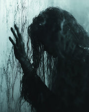 “Whispers Behind the Wall” captures a haunting moment frozen between despair and the supernatural. A dark silhouette, soaked and ghostly, presses against a misted wall, as if trapped between worlds. The wet textures, the blurred form, and the dim, muted colors create an atmosphere heavy with sorrow, fear, and mystery. This artwork is a perfect piece for those drawn to emotional horror, atmospheric nightmares, or eerie visual storytelling.