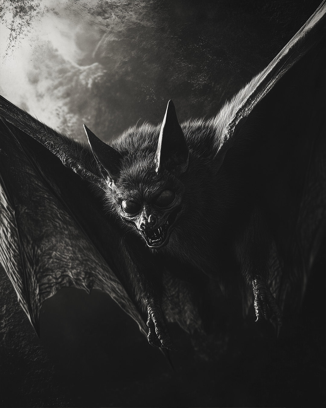 “Lunar Shriek” captures the primal terror of a predator in flight. With wings outstretched and fangs bared, this hyper-detailed bat soars against a hauntingly lit sky. Rendered in stark black and white, the image blends gothic elegance with predatory menace. Perfect for admirers of nocturnal creatures, vampire aesthetics, or dark nature art that doesn’t shy away from intensity.