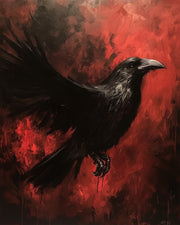 “The Omen” captures a powerful black raven in mid-flight, silhouetted against a violent red backdrop. The rough, painterly textures enhance the bird’s presence — an ancient symbol of mystery, death, and prophecy. This striking composition evokes both awe and unease, speaking to the raven’s role as watcher, guide, and harbinger. Ideal for lovers of gothic nature art, occult symbolism, and moody wildlife imagery, this piece delivers a raw, visceral impact.