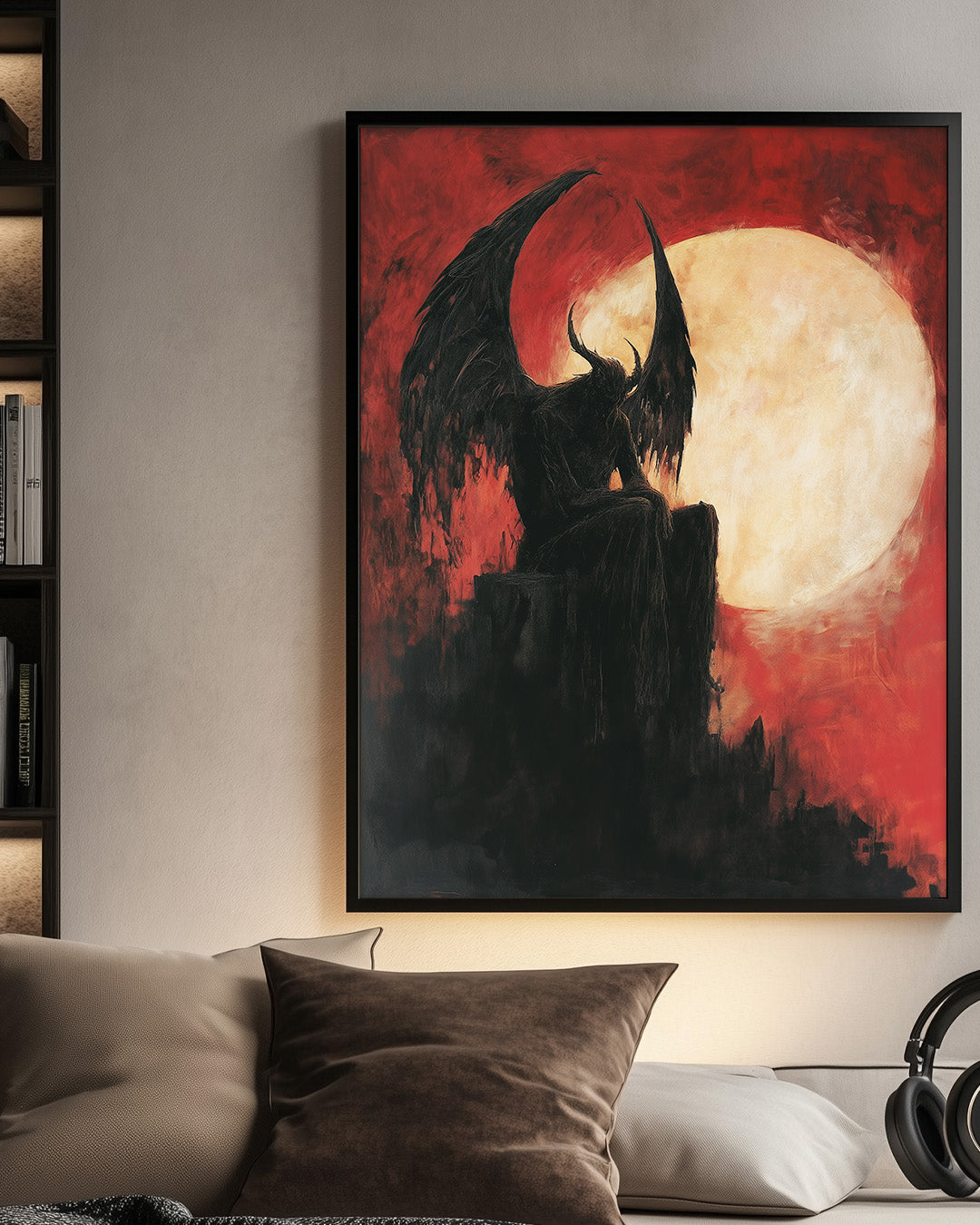 “The Mourning Horns” is a portrait of forgotten power. Perched upon a jagged throne against the burning glow of a blood-red moon, a horned, winged entity sits in silence. Once a bringer of chaos or a fallen deity, now reduced to a watcher in a dying world. The painting blends gothic melancholy with occult symbolism, perfect for those drawn to demonology, fallen angels, and the poetry of lost power. Hang this and let your space echo with ancient silence and unspeakable stories.