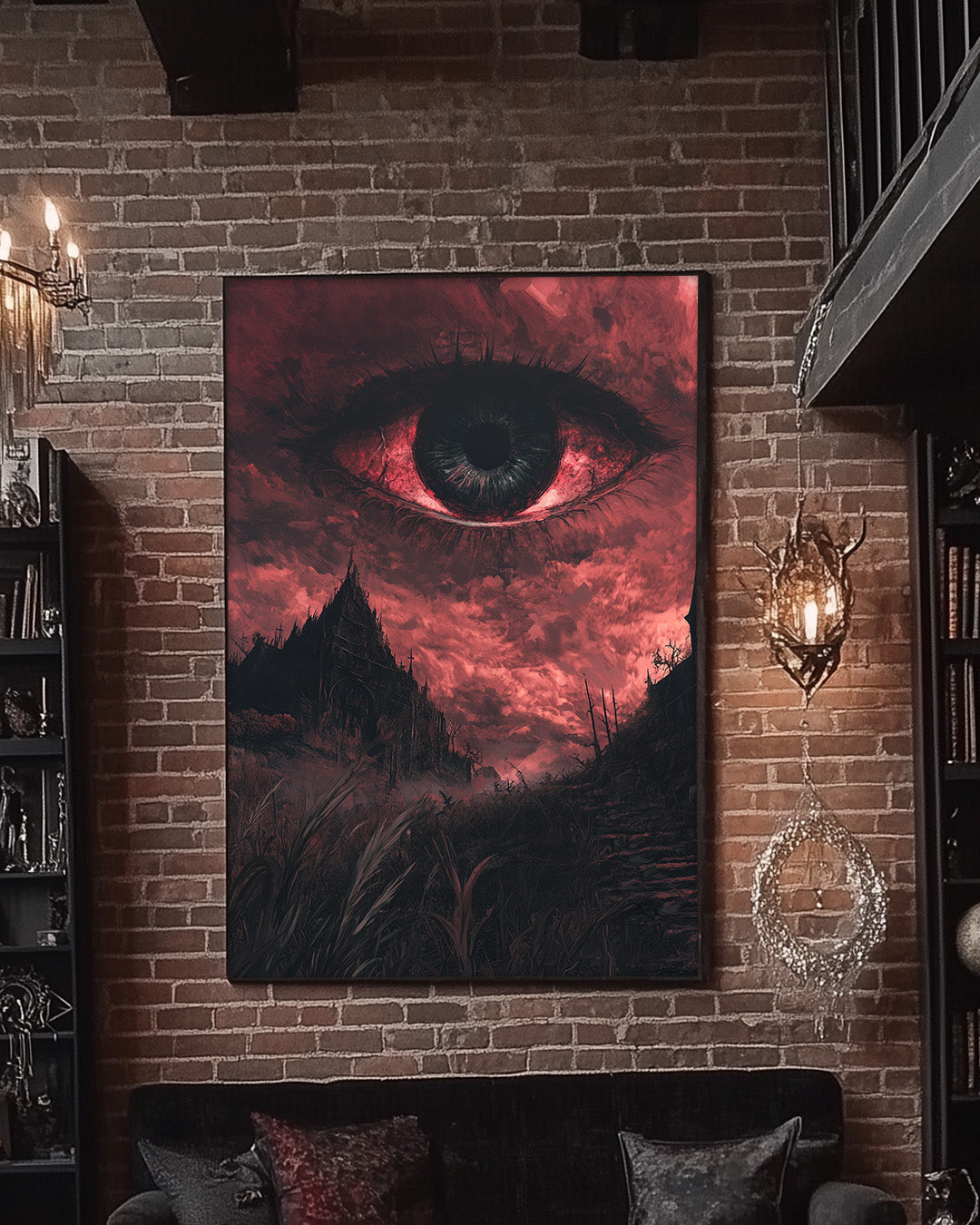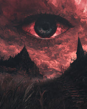 “The Watcher Above” captures a moment of revelation and terror. A single, bloodshot eye gazes down from a corrupted sky, casting its stare over a dying world of twisted spires and forgotten churches. The landscape is both sacred and forsaken, as if something has answered — or replaced — the divine. This artwork invokes apocalyptic mysticism, ancient watchers, and cosmic horror in a single surreal vision. For those who love their occult art with a dose of the unknowable, this poster is an omen you can hang on your wall.