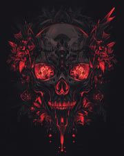 Infernal Bloom is a vivid, surreal fusion of skeletal form and botanical terror. A glowing red skull, surrounded by blooming flowers and sharp ornamental elements, radiates an aura of chaos and beauty. The eyes burn with mechanical intensity, hinting at unnatural life. This piece merges the organic and the demonic, making it perfect for fans of dark surrealism, occult symbolism, and cyber-gothic decor.